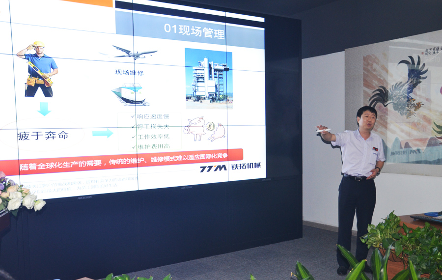 隨后,副總經(jīng)理高岱樂向考察團(tuán)展示鐵拓機(jī)械遠(yuǎn)程服務(wù)系統(tǒng),分享鐵拓機(jī)械服務(wù)型制造模式思路。他向考察團(tuán)介紹到,互聯(lián)網(wǎng)正在改變中國(guó),同時(shí)也在改變世界,鐵拓機(jī)械想利用互聯(lián)網(wǎng)更好的為客戶做好服務(wù)工作。遠(yuǎn)程服務(wù)系統(tǒng)運(yùn)營(yíng)上線,首先改變了傳統(tǒng)的售后服務(wù)模式,在機(jī)械設(shè)備故障發(fā)生時(shí),鐵拓機(jī)械技術(shù)工程師通過系統(tǒng)就可以了解設(shè)備使用情況并及時(shí)找到問題,在家解決問題,縮短服務(wù)時(shí)間和成本,為客戶提供便利。同時(shí)該系統(tǒng)還兼具預(yù)警功能,通過設(shè)備大數(shù)據(jù)分析,對(duì)設(shè)備核心部件使用情況能夠及時(shí)預(yù)警,降低設(shè)備故障率,降低設(shè)備的維護(hù)成本。